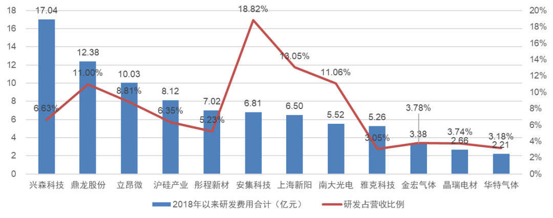 自2018年至今,国内半导体材料企业创收均超过2亿元,并都在持续加大研发费用支出投入。兴森科技、鼎龙股份、立昂微、沪硅产业、彤程新材、安集科技、上海新阳、南大广电和雅克科技这几年间共计投入了超过5亿元用于研发,并且大多数公司的研发费用占营收的比重都超过了5%,有望助力我国半导体产业国产化率深化趋势,提高我国半导体产业的自主性。