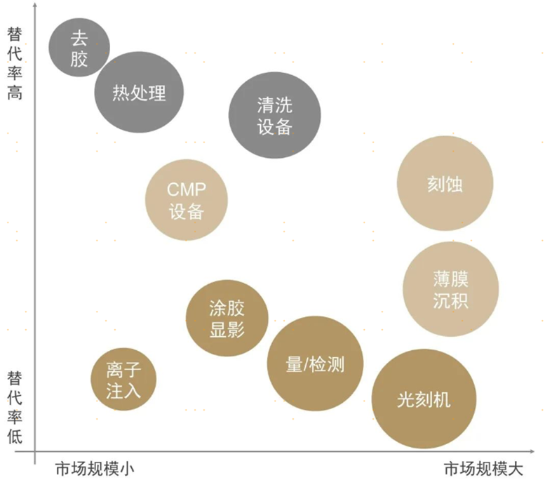 从国产化率来看,我国去胶、热处理和清洗等半导体工艺环节设备国产化率相对较高(约大于30%),刻蚀、薄膜沉积、CMP等环节设备国产化率正逐步提升(约10%-30%),光刻、量检测、离子注入、涂胶显影等环节设备国产化率仍较低(约小于10%)。