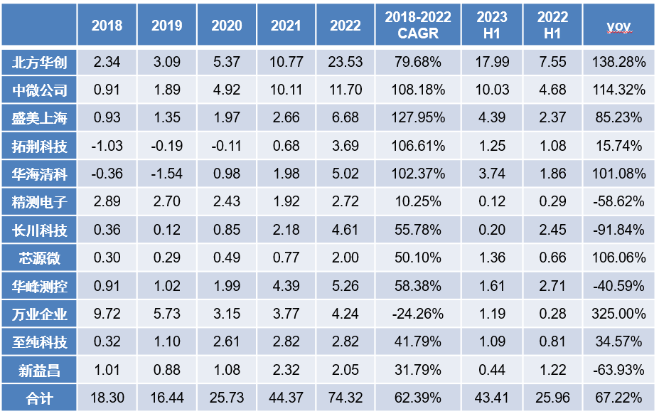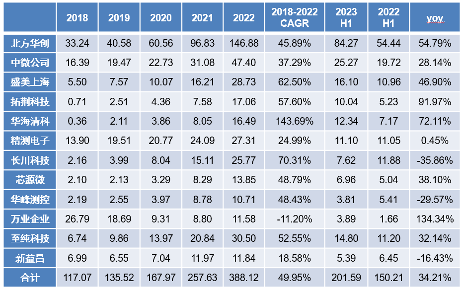 表:半导体设备核心公司2018-2023H1营业收入情况(亿元)