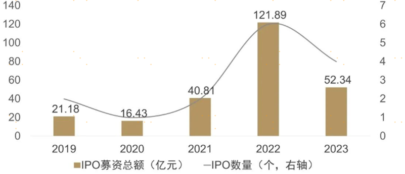2019年-2023年,A股半导体设备行业IPO数量及募资金额整体呈现波动上升趋势,2023年IPO数量为4个,募集资金总额达52.34亿元,虽然相较2022年峰值有所下滑,但仍然处于较高水平。