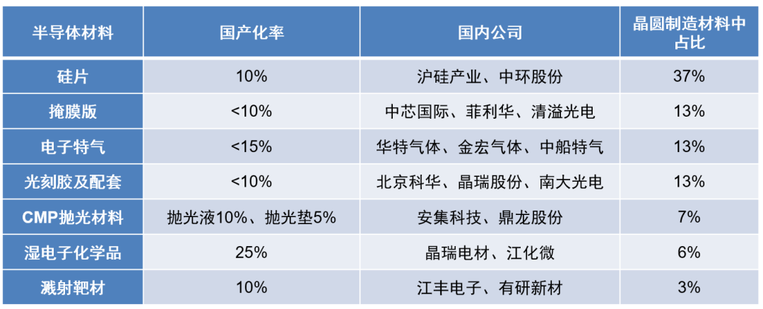 我国半导体材料国产化率仍处于低位,硅片和溅射靶材国产化率为10%,光刻胶及配套和掩膜版国产化率不到10%,电子特气国产化率不到15%,CMP抛光材料中抛光液国产化率为10%,抛光垫为5%,湿电子化学品当下国产化率最高,也仅为25%,可提升空间极大。国内的材料公司正经历崛起,各领域有领先的龙头公司,在半导体产业中正逐渐崭露头角,未来有望带领加速国产化率深化。