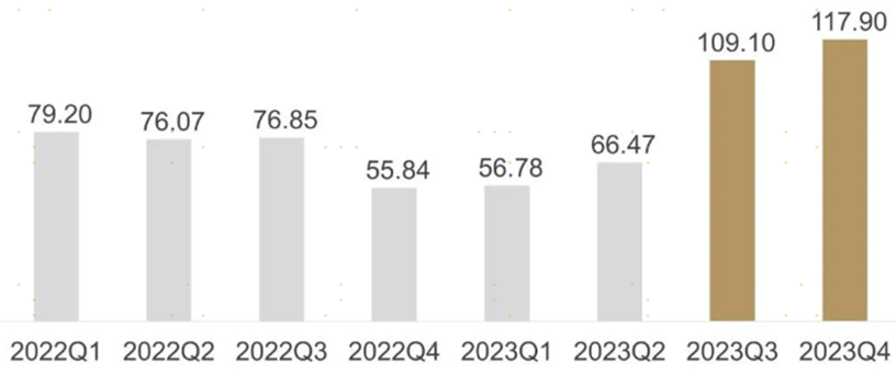 图:中国大陆半导体设备销售额 (亿美元 ,2015Q1-2023Q3)