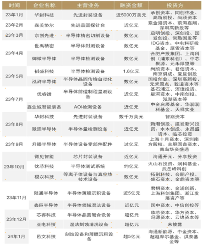 近年来,以国家产业政策支持、行业市场化驱动及国产替代为主要发展背景,国内半导体产业链持续完善,作为半导体产业链的重要组成部分,半导体设备行业吸引了一二级市场主体的持续关注。2023年以来,一级市场资金持续投入半导体设备行业,多家半导体设备企业获得了数亿元的融资。