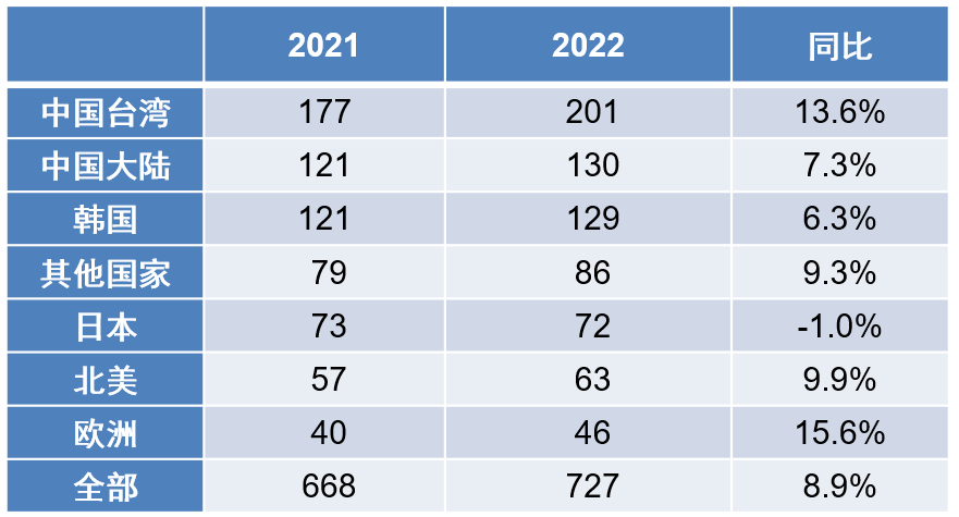 表:半导体材料分地区销售额(亿美元,2021-2022)