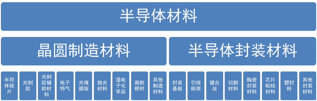 半导体材料包括晶圆制造材料和半导体封装材料。其中,晶圆制造材料包括半导体硅片、光刻胶、光刻胶辅助材料、电子特气、光掩膜版、抛光材料、湿电子化学品、溅射靶材和其他制造材料等。半导体封装材料包括封装基板、引线框架、键合丝、切割材料、陶瓷封装材料、芯片粘结材料、塑封料(EMC)和其他封装材料等。