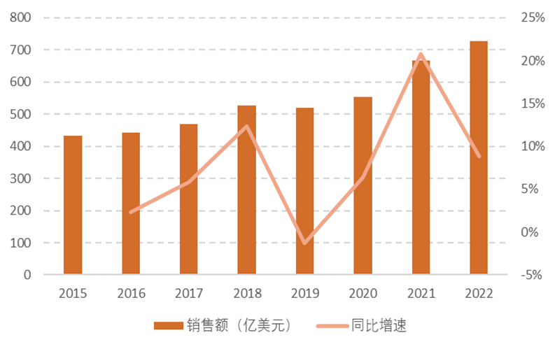 图:半导体材料全球销售额及变化(亿美元,2015-2022)