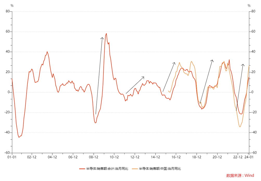 全球半导体销售额同比增速在2023年2月至5月均在-20%以下,仅次于2000年互联网泡沫低点和2008年的金融危机低点;6月以来半导体销售降幅逐渐收窄,至11月回正,显示半导体周期触底反弹。