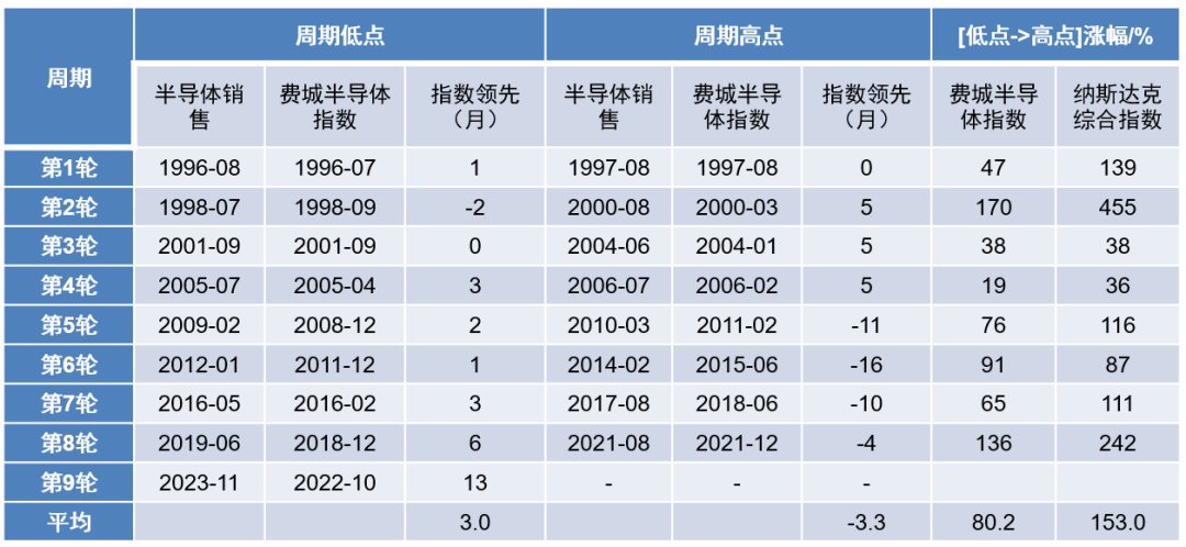 从90年代以来的几轮全球半导体周期来看,费城半导体指数周期波动跟随半导体销售周期,且指数的周期低点平均领先半导体周期3个月左右,05年以来,指数领先时长提升至1-2个季度,本轮周期,指数领先时长延至1年左右。从每一轮周期低点到高点,费城半导体指数的平均涨幅为80%,纳斯达克综合指数的平均涨幅为153%。