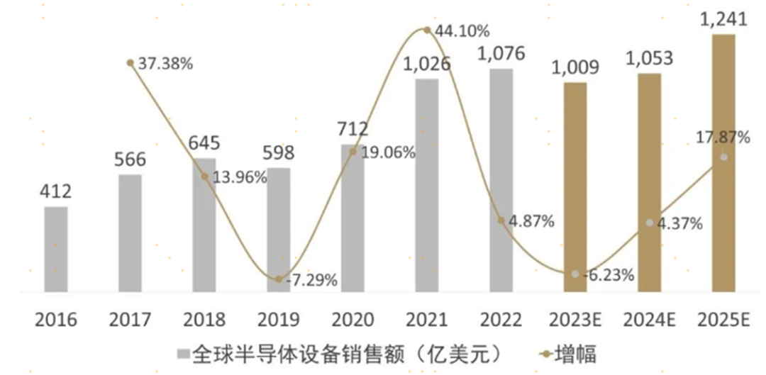 SEMI预测2023年全球半导体设备销售额将从2022年创纪录的1076亿美元降至1009亿美元,减少6.23%,在2024年、2025年或将复苏至1053、1241亿美元。SEMI总裁兼首席执行官表示:“半导体设备市场在经历了2023年的调整之后,预计2024年将出现强劲反弹。由高性能计算和无处不在的连接驱动的长期强劲增长预测保持不变。”