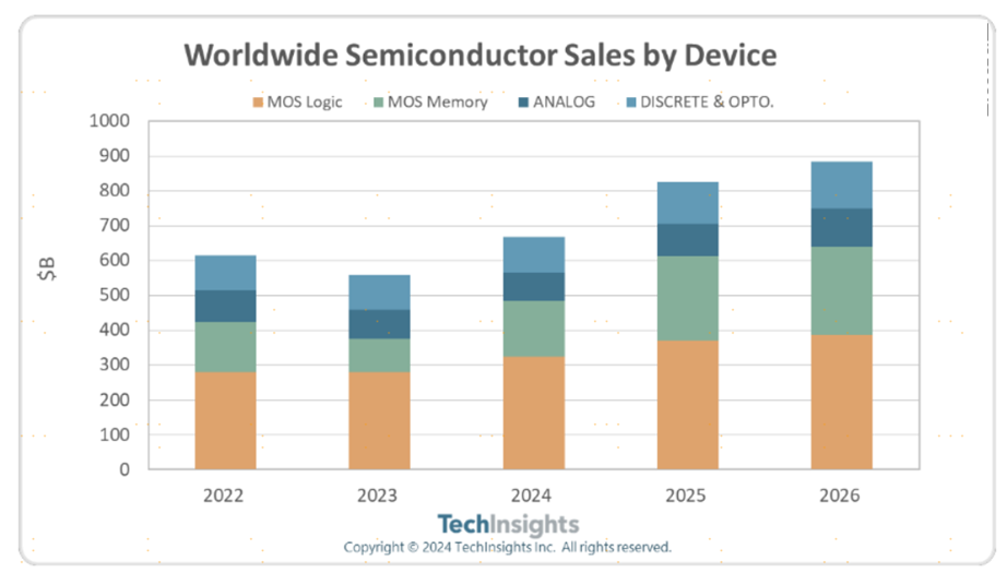 TechInsights 3月12日最新发布全球半导体市场预测,预计2024年行业有望强势反弹,市场规模将超过6500亿美元,全球半导体销售额增速或将达到24%。2025年或将增至超过8000亿美元,2026年或将进一步增至接近9000亿美元。
