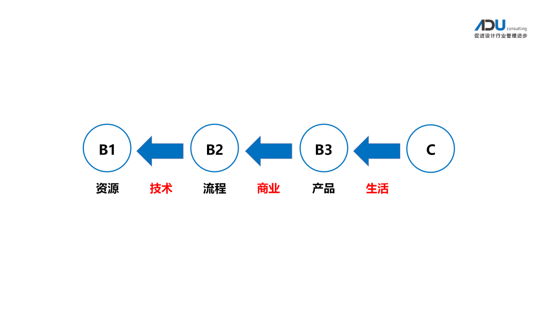 上面是ADU的产业链模型。其中,B3是B to C业务,B1、B2是B3 的供应商,是B to B业务。在增量时代,迅速扩大产能是经济增长的驱动力。B3为了迅速扩大产能,有一块钱想办十块钱的事,就要求它的供应商B2垫资,或者拉长账期。B2也会以同样的条件要求B1。因此,B1、B2、B3之间不仅是业务合作,也是一种资本合作。不仅如此,B1还让C为它垫资。比如房产的期房销售实际上也是一种垫(融)资行为。于是,众望所归的B3在供应商和消费者的垫资支持下,成了商界翘楚。这个套路在增量时代,尤其是资金周转快的时候是能玩得转的,大家都能分一杯羹。一旦行情逆转,B3没钱了,C端的垫资变成了“交保楼”问题,B3欠银行和金融机构的钱变成了“爆雷”。最惨的是垫资的供应商。虽然有供应商找甲方打官司的,但很少听说甲方因此“爆雷”的。没想到,最佳手段融资是垫资。设计公司该怎么办?传统设计公司处于产业链的末端,也就是B1的地位,几乎没有什么供应商,也就无法转嫁垫资的风险。为避免中间商赚差价,降低经营风险,设计公司尽可能与B3甲方直接签合同,但还是无法规避垫资的风险。顺便说一句,设计公司对为数不多的供应商压榨起来似乎也毫不留情。有家设计公司这两年现金流紧张,欠效果图公司几十万的款,设计公司提出打折结账,条件是打三折马上付款,打五折要再等几个月。那家效果图公司一开始不同意这条件,但第二天就屈服了,同意三折。