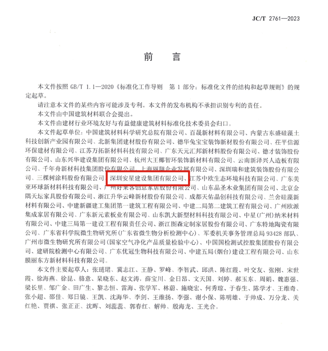 据悉,该标准于2021年由建材行业环境友好与有益健康建筑材料标准化技术委员会归口上报及执行,中国建筑材料科学研究总院有限公司、深圳安星建设集团有限公司等42个单位起草编制。历经两年反复审查、质询、讨论及完善,《装饰装修净化功能板材净化性能技术要求》成功于2023年12月由中华人民共和国工业和信息化部发布公告,宣告标准可广泛实施。