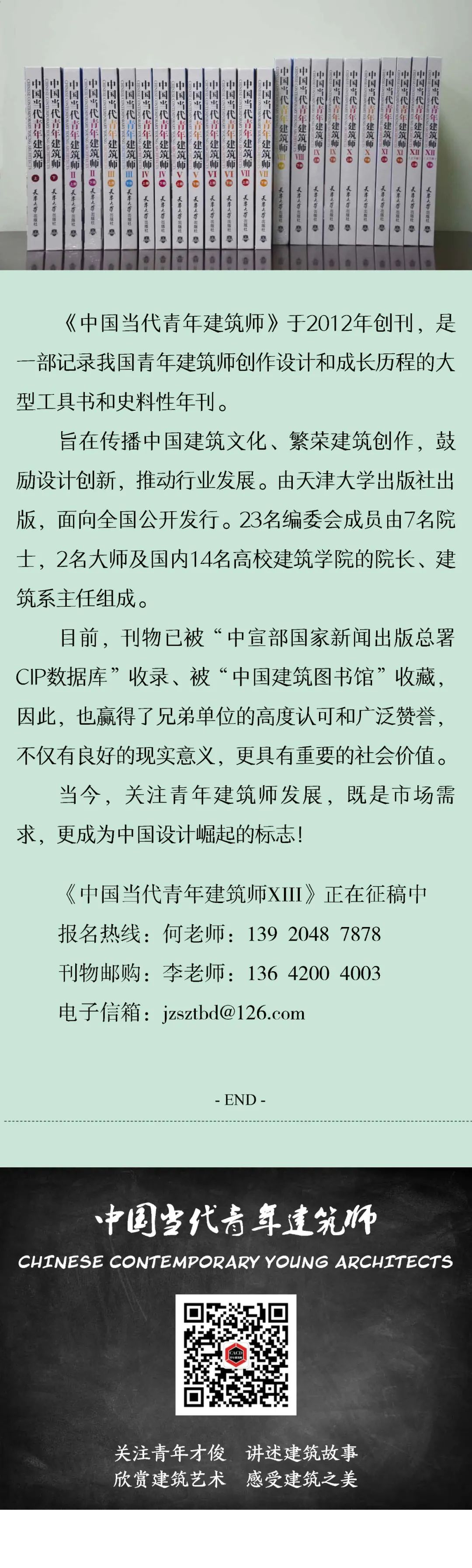 天津大学出版社作为专业建筑图书出版机构,10多年以来,坚持出版《中国当代青年建筑师》系列,期望以此打造中国青年建筑师展示设计作品、相互交流借鉴的平台,期望以此作为突显中国建筑设计水平和展现中国建筑设计力量的窗口。在编者多年的努力和战略合作伙伴的支持下,此目的已基本达成。