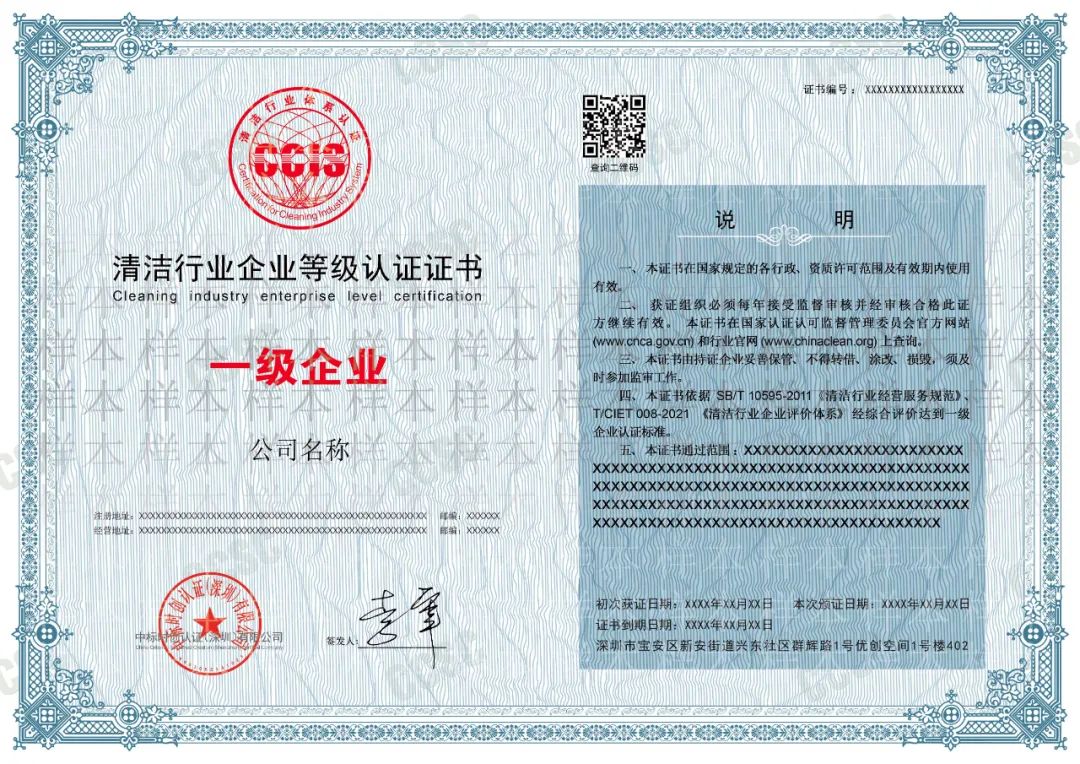 CCIS2000认证证书为国家认监委备案,是基于标准的清洁行业经营服务认证,可以更好地帮助保洁机构、环卫机构、物业机构等涉及清洁服务的组织通过客观、量化的形式展示自己的服务能力,提升市场影响力。