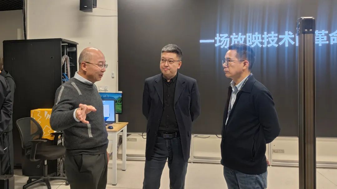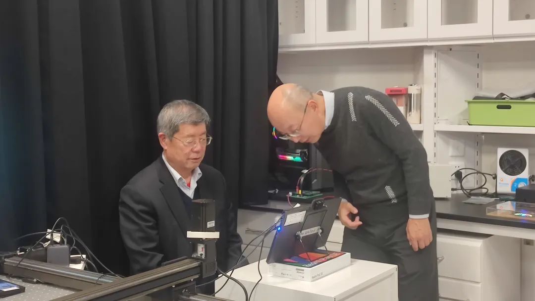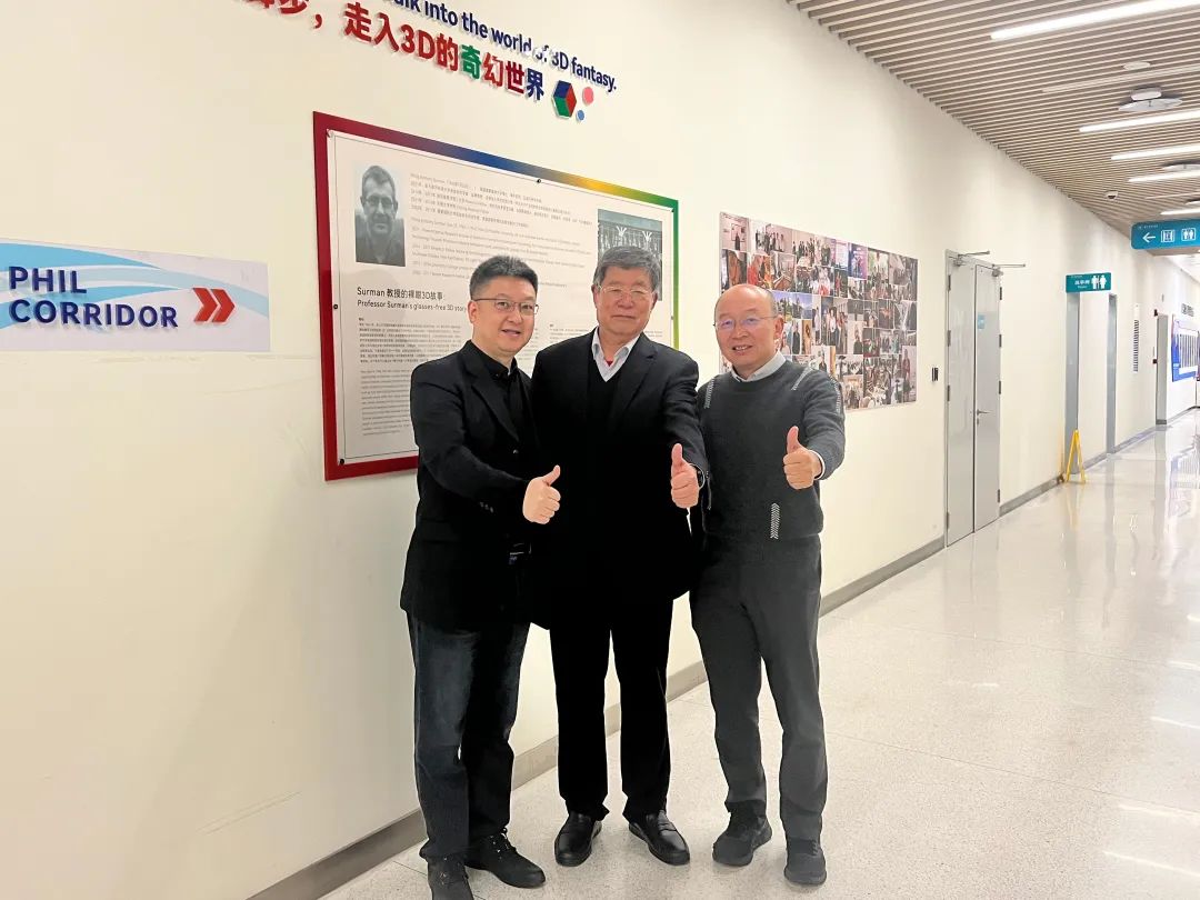 在参观期间,孙小卫教授介绍了课题组最新的研究成果和对显示技术的前沿探索,邀请梁新清秘书长、胡春明副秘书长亲身体验了实验室的Micro-LED、裸眼3D样机,展示了该实验室在新型显示领域取得的重要进展。