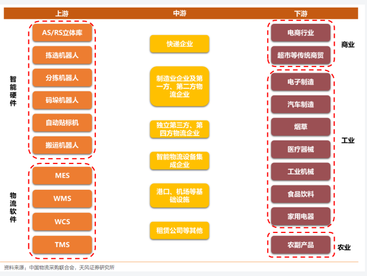 从智慧物流的产业链构成来看,其上游环节涵盖了包括立体库、AGV、自动码垛机等在内的核心硬件设备,以及WMS、WCS、MES等核心软件系统。这些硬件和软件共同构成了智慧物流的基础设施和技术支撑。而在下游,智慧物流可以广泛应用于电商行业、制造业、农业等多个领域,为这些具有实物交割需求的行业提供高效、智能的物流解决方案。