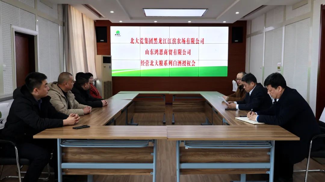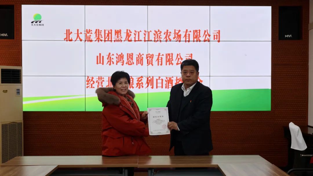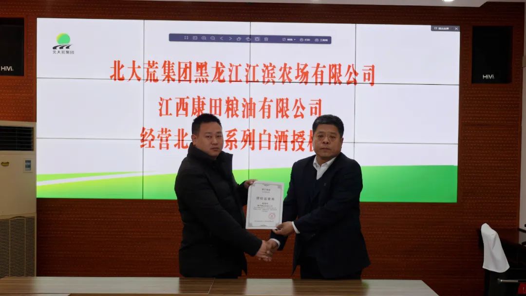3月21日,江滨农场有限公司举行了经营北大粮系列白酒授权会,与山东鸿恩商贸有限公司、江西康田粮油有限公司进行了授权仪式。