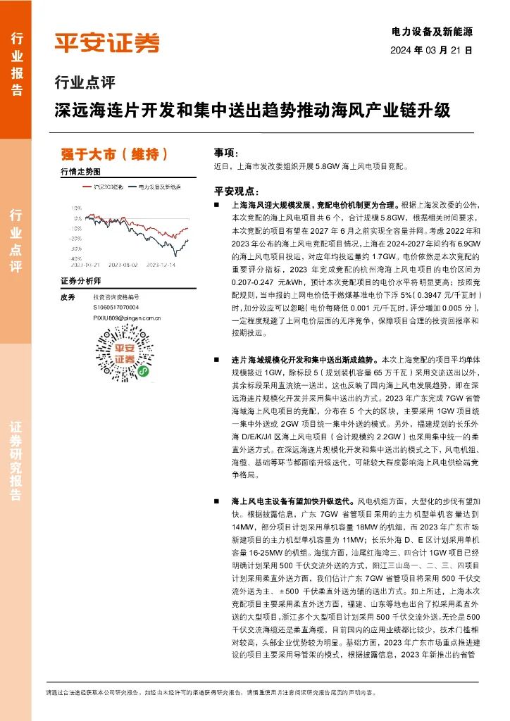 海上风电主设备有望加快升级迭代。风电机组方面,大型化的步伐有望加快。根据披露信息,广东7GW省管项目采用的主力机型单机容量达到14MW,部分项目计划采用单机容量18MW的机组,而2023年广东市场新建项目的主力机型单机容量为11MW;长乐外海D、E区计划采用单机容量16-25MW的机组。海缆方面,汕尾红海湾三、四合计1GW项目已经明确计划采用500千伏交流外送的方式,阳江三山岛一、二、三、四项目计划采用柔直外送方面,我们估计广东7GW省管项目将采用500千伏交流外送为主、±500千伏柔直外送为辅的送出方式。如上所述,上海本次竞配项目主要采用柔直外送方面,福建、山东等地也出台了拟采用柔直外送的大型项目,浙江多个大型项目计划采用500千伏交流外送。无论是500千伏交流海缆还是柔直海缆,目前国内的应用业绩都比较少,技术门槛相对较高,头部企业优势较为明显。基础方面,2023年广东市场重点推进建设的项目主要采用导管架的模式,根据披露信息,2023年新推出的省管7GW项目同样主要采用导管架基础,其他省份新推出的水深超过40米的海风项目数量明显增加,估计导管架的应用占比也将明显提升。