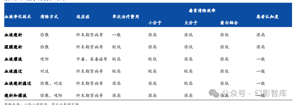 各种净化技术各有所长,也可相互结合使用,在实际应用时需通过临床使用、治疗效 果、治疗费用多维度进行参考。血液透析主是清除小分子物质如尿素、肌酐,原理是 通过弥散,即分子从浓度高的区域向浓度低的区域运动。但血液透析只能清除小分子 物质,且比较缓慢。血液滤过主要清除水分和中大分子物质,采用对流的方式,在溶 质能通过半透膜的前提下,在一侧给予压力可使得该物质快速通过半透膜。血液灌流 利用吸附原理可以清除中大分子物质。