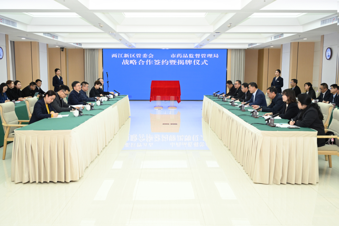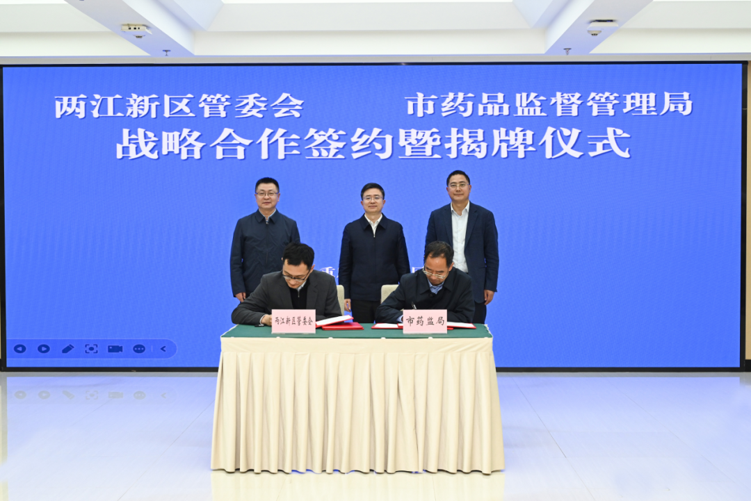 3月18日下午,两江新区与市药监局签署战略合作协议。两江新区生命健康产业服务中心、渝药创新生态链建设办公室同步揭牌。