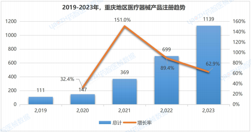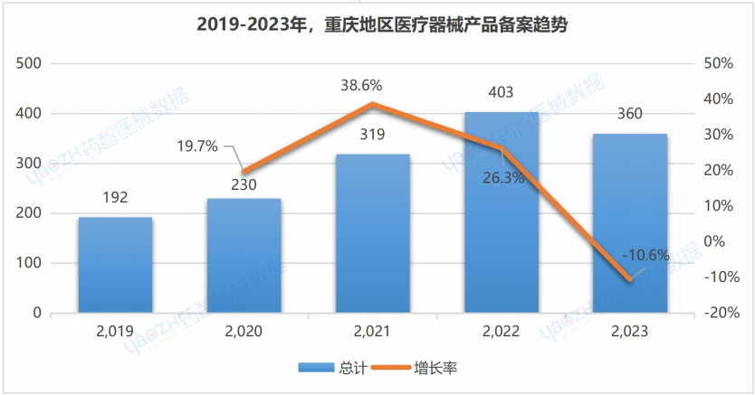 在产品注册方面,2019年至2023年,重庆地区的医疗器械产品注册备案数量总体呈现上升态势。