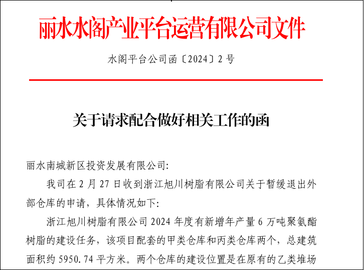 浙江旭川树脂有限公司2024年度有新增年产量6万吨聚氨酯树脂的建设任务,该项目配套甲类及丙类仓库两个,总建筑面积约5950.74平方米。两个仓库在该司原有乙类仓库的基础上建设,建设期间需将原有的乙类仓库堆场2000㎡进行围挡,其中约2500吨物料需全部转移出来。但鉴于化学品的特性,吨罐不能露天堆放,故该司租赁浙江顺虎德邦涂料有限公司在云景路100号的仓库作为临时仓库。今年2月,浙江顺虎德邦涂料有限公司在云景路100号场地被丽水南城新区投资发展有限公司回收另用,而目前正值浙江旭川树脂有限公司仓库的建设期,另寻其他仓库及转移2500吨物料存在一定的困难。