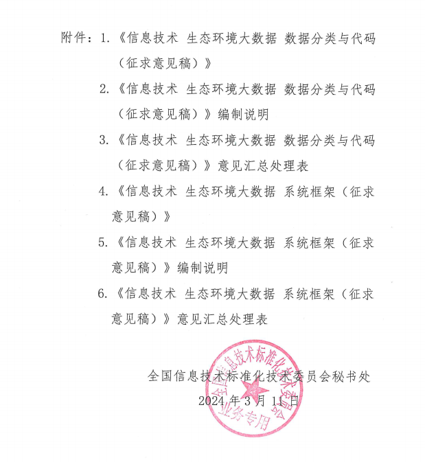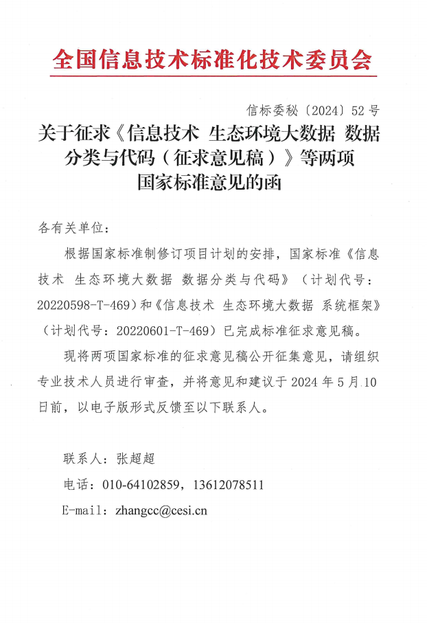 根据国家标准制修订项目计划的安排,国家标准《信息技术 生态环境大数据 数据分类与代码》(计划代号:20220598-T-469)和《信息技术 生态环境大数据 系统框架》(计划代号:20220601-T-469)已完成标准征求意见稿。现将两项国家标准的征求意见稿公开征集意见,各成员单位相关专业技术人员可进行审查,并将意见和建议于 2024年5月10日前,以电子版形式反馈至联系人,原文详见下图。