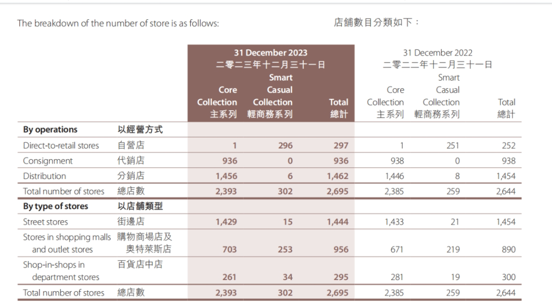 营业收入35亿,增长14.8%,净利增长18.4%。存货周转180天,应收周转42天,应付周转130天。自营及加盟店铺2695家,其中新开51家,包含奥莱店22家,未达成去年计划新开100的目标,年报解释是优质点位的店铺供应有限。从这点看来,头部服装企业运营好,长尾创业者很难跑出来。