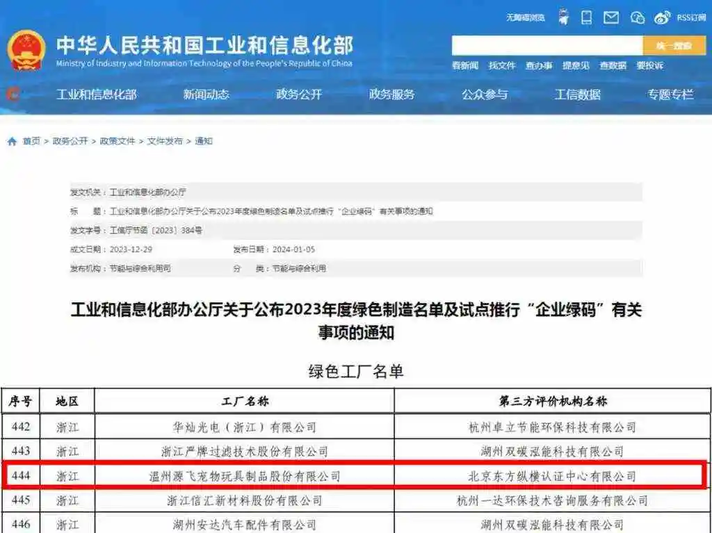 白皮书团队讯,近日,工信部正式公布了2023年度绿色制造名单,源飞宠物获评“国家级绿色工厂”称号。据悉,此次评选由工信部在全国范围内组织开展,入选企业须满足基础设施、管理体系、能源投入、环境排放等多个指标的高标准和严要求,并经过自评、第三方机构评价、省级工信部门评估确认及专家论证、公示等程序最终选出。