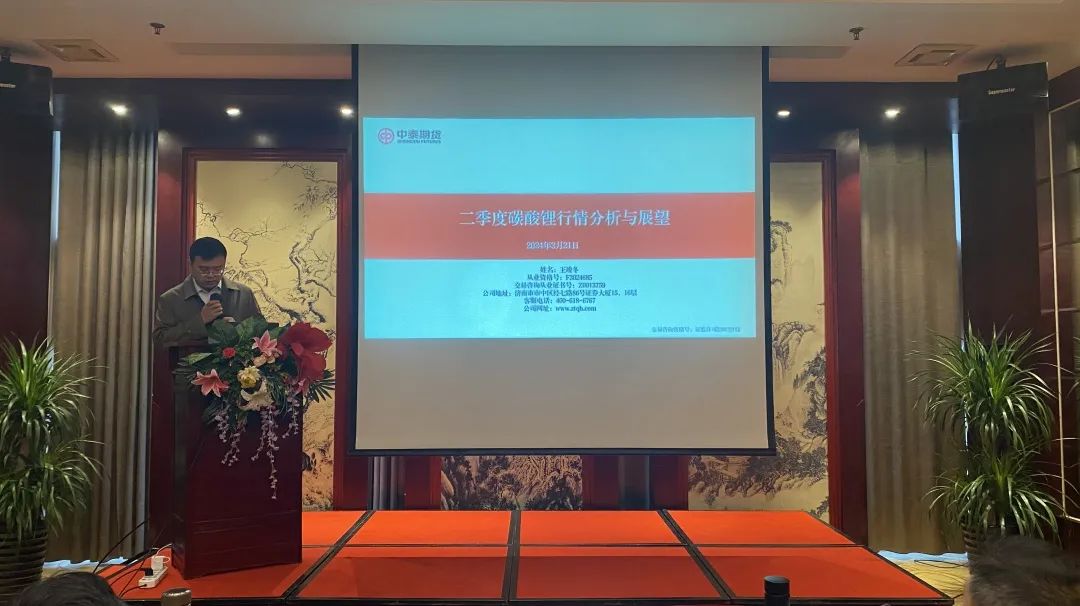 中泰期货研究所高级研究员王竣冬作了二季度碳酸锂行情分析与展望,中泰期货股份有限公司潍坊分公司IB负责人孙小萌、北京智尚资产管理有限责任公司高级合伙人、股东发起人熊瑛,分别就碳酸锂期货相关知识、碳酸锂期权基础、期货工具服务锂电产业路径模式以及企业风险管理案例等进行了深入解读。
