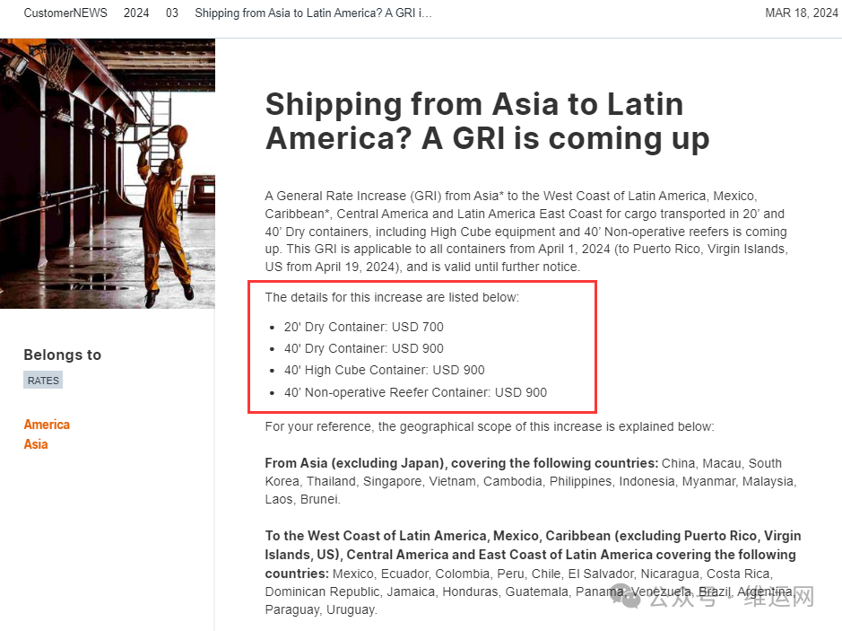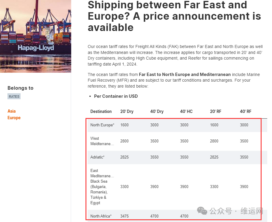 赫伯罗特发布公告称,2024年4月1日,在远东和北欧以及地中海之间往返的FAK费率将上调,提价适用于20英尺和40英尺集装箱(包括高柜和冷藏箱)运输的货物。具体收费标准如下:赫伯罗特征收亚洲到拉丁美洲GRI