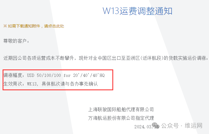 近期因公司各项运营成本不断攀升,现针对全中国区出口至亚洲区(近洋航段)的货载实施运价调涨:调涨幅度:USD 50/100/100 for 20'/40'/40'HQ生效周次:WK13, 具体航次请与各办事处确认