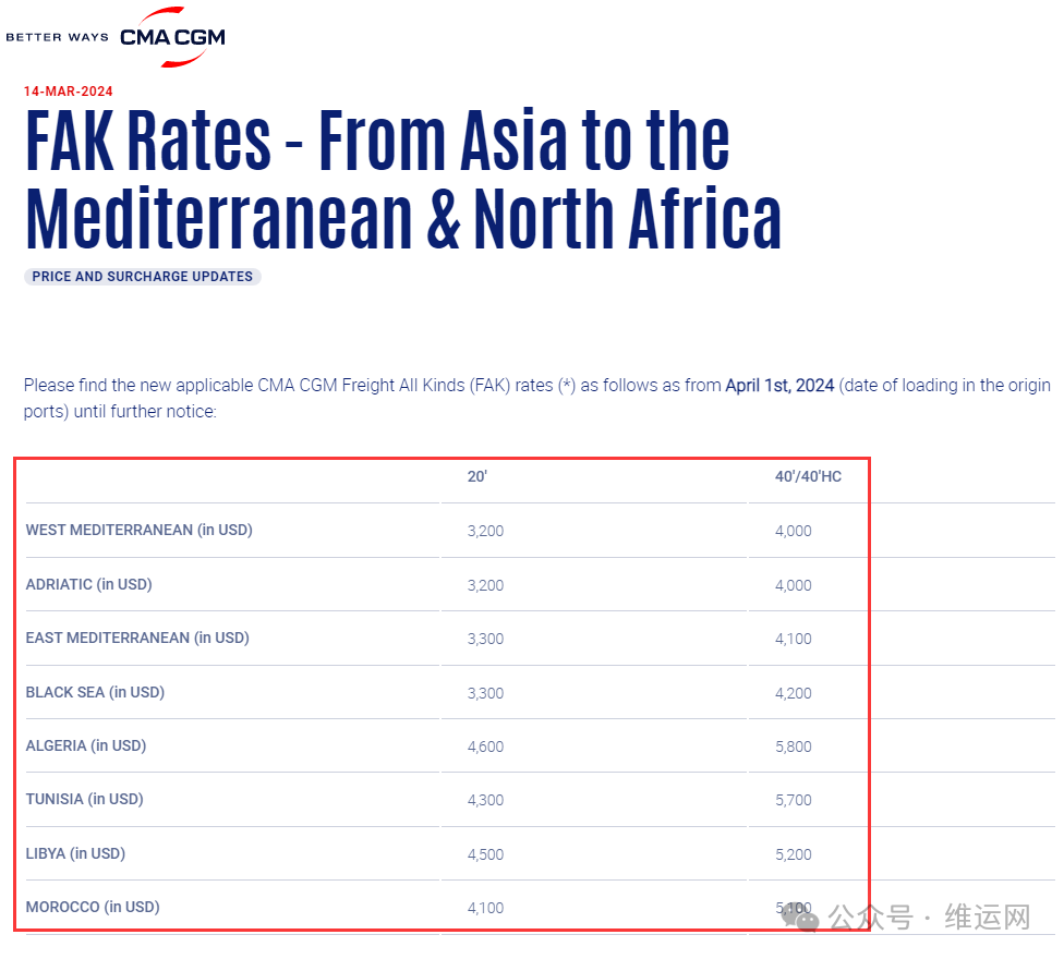 赫伯罗特发布公告,从亚洲到拉丁美洲、墨西哥、加勒比海和中美洲的20英尺干货集装箱征收GRI,标准为700美元,40英尺干货集装箱货物(包括高箱和40英尺非运行冷藏箱)标准为900美元,自2024年4月1日起适用于所有集装箱,有效期至另行通知。详情如下:CMA从亚洲到地中海和北非FAK费率调整