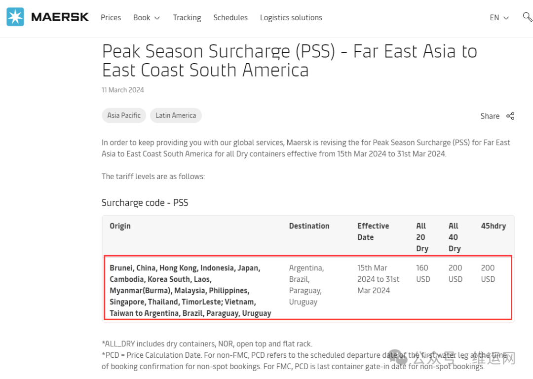 CMA更新从亚洲到地中海和北非FAK费率。自2024年4月1日(装货日期)起生效,直至另行通知。具体收费标准如下:为了继续为您提供全球服务,马士基正在修订从2024年3月15日至2024年3月31日生效的所有干货集装箱的远东至南美东海岸旺季附加费(PSS)。详情如下: