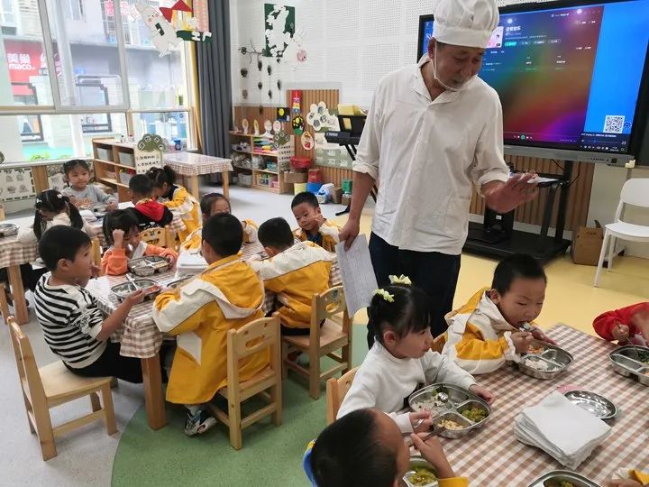 我园每天安排行政人员、厨房人员陪同孩子就餐,品尝餐食并了解幼儿的喜好。每次陪餐结束后,及时反馈幼儿餐食情况,促进厨房不断提高膳食质量。