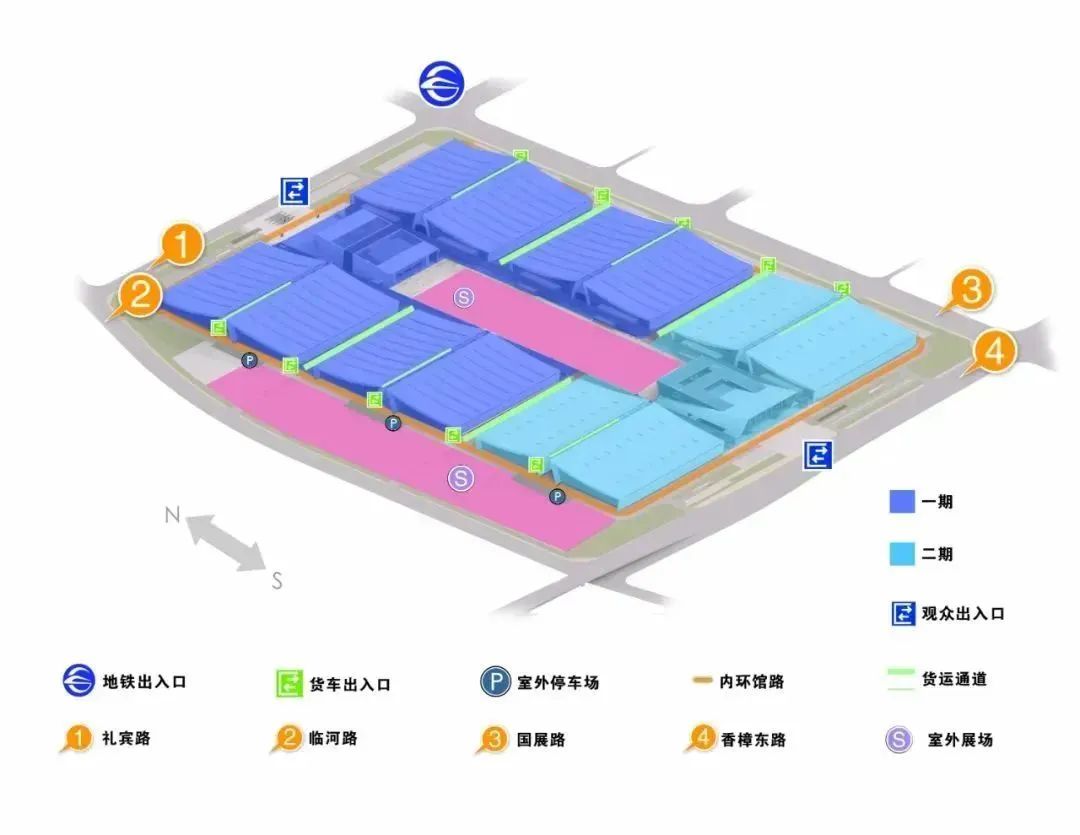 项目分两期建设。一期已于2016年11月建成运营,主要包括北面4组8个展馆、北登录厅、中心广场、西广场及内廊,其中单馆室内展览面积约1.35万㎡,室内总展览面积约11.4万㎡,可提供室内标准展位约6000个,室外总展览面积约10万㎡。硬件设施设备可承接国内外各类大型专业巡回展。二期包括南面2组4个展馆、南登录厅。