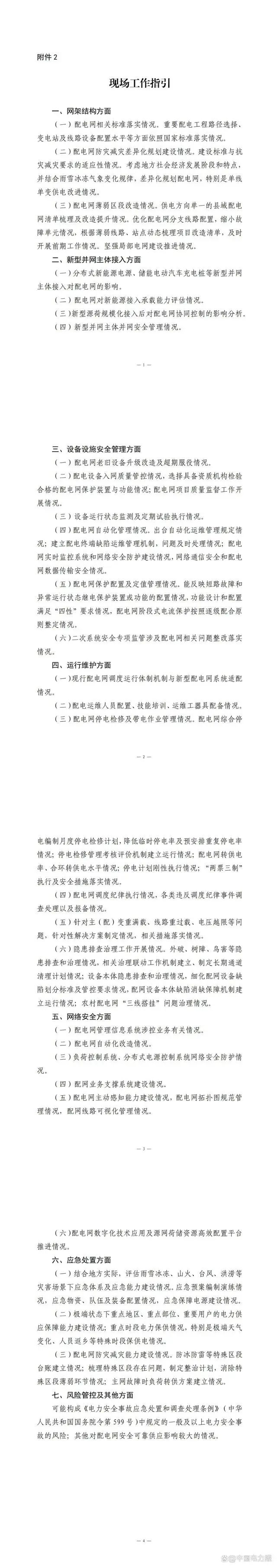 现行配电网调度运行体制机制与新型配电网系统适配情况;配电网人员和运维工器具配置情况;主(配)变重满载、线路重过载、电压越限等运行风险摸排和解决情况;安全风险管控和隐患排查治理等安全管理制度落实情况;配电网电力监控系统网络安全管控情况;停电检修及带电作业管理情况;农村配电网“三线搭挂”问题治理情况。