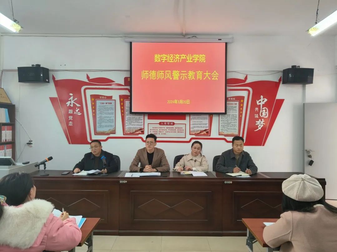 师德为魂,师风为标。为深入贯彻落实党的二十大决策部署和习近平总书记关于师德师风建设的重要论述,全面贯彻党的教育方针,坚持立德树人根本任务,强化师德师风建设,规范教师行为,弘扬正能量,展现教师的崇高形象。3月20日下午,数字经济产业学院于B201会议室召开师德师风警示教育大会,此次会议由院长谭文武主持,党总支书记张文凤、副院长朱伙军、党总支副书记郭伟光和我院全体教师参加。