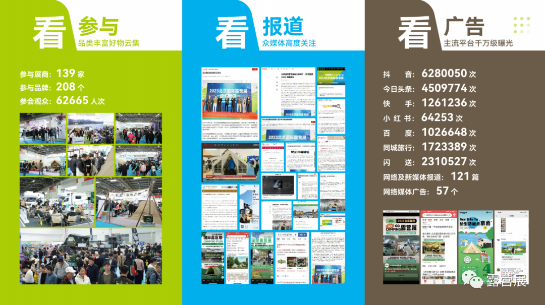 北京国际露营展是国内首次以露营创造品质生活为核心内涵,汇聚露营地、露营设施、露营装备和用品、食品等六个露营板块的产品和服务,以及房车露营的大型专业展会,展会专业性、技术性、创新性的内在品质得到淋漓尽致的展示。国内外知名露营品牌悉数亮相,产品和服务齐全,观众云集,交易活跃,成果显著,众多展商硕果累累。同期举办的论坛、研讨、分享等主题活动,凝聚露营行业合力,研判露营产业发展趋势,对品牌快速了解市场,摸清发展趋势提供了切实的帮助。产品宣传、露营经验分享均取得了良好的效果,吸引了众多的粉丝和观众。媒体集中宣传报道,让北京露营展声名远播。