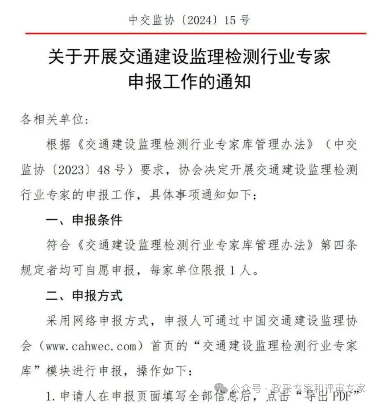 根据《交通建设监理检测行业专家库管理办法》(中交监协(2023)48号)要求,协会决定开展交通建设监理检测行业专家的申报工作,具体事项通知如下: