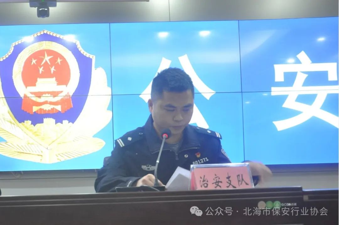 会上,治安支队陈颖全副支队长宣读了《北海市公安局关于深入推进警务工作与保安等行业联勤联动工作实施方案》。
