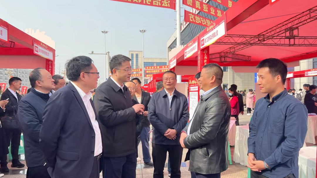 宜宾市人力资源和社会保障局局长李小林在宜宾市三江区人力资源市场专场招聘会现场视察厦门专区,宜宾市驻福建省农民工服务中心负责人暨厦门市宜宾商会顾问作专题汇报。