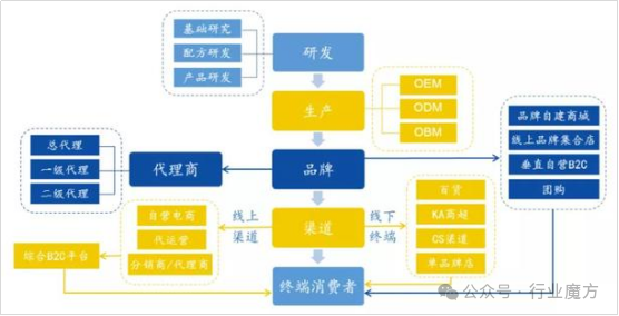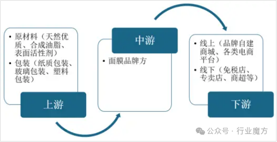 面膜产业链覆盖上游原材料、包装,中游为面膜品牌方,下游渠道,再到消费者。伴随着面膜行业的快速发展,代工厂商、代运营商也逐渐成为了面膜产业链的重要参与者。