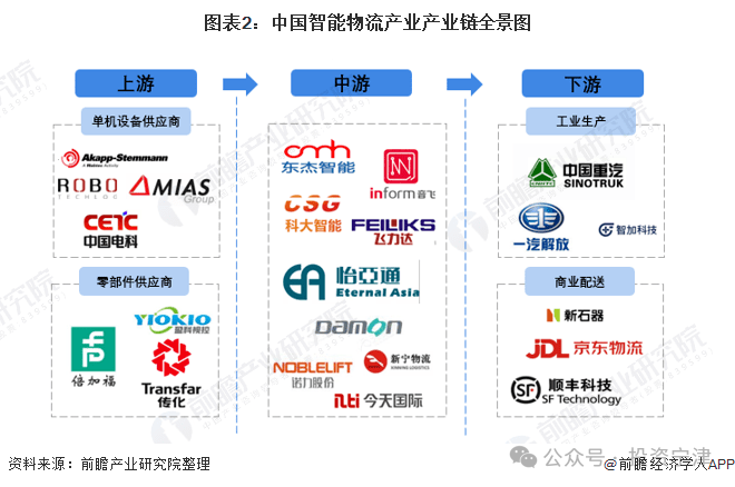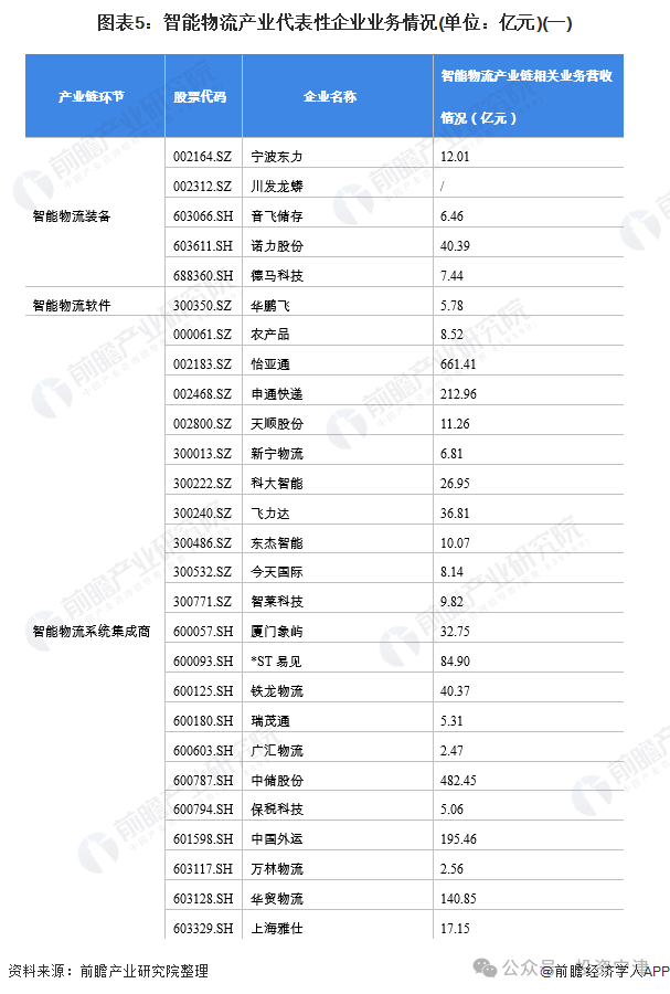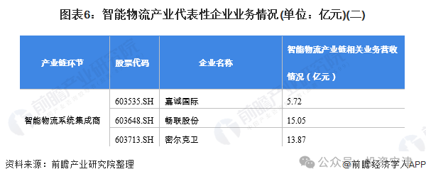 智能物流产业主要上市公司:东杰智能(300486)、佳顺智能(834863)、机器人(300024)、怡亚通(002183)、中储股份(600787)、诺力股份(603611)、飞力达(300240)、嘉诚国际(603535)、天顺股份(002800)、今天国际(300532)、德马科技(688360)、音飞储存(603066)、华鹏飞(300350)、兰剑智能(688557)等。