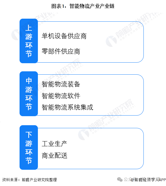 智能物流行业产业链主要分为上、中、下游三个部分。上游主要为单机设备和零部件提供商;中游是解决方案提供商,自身拥有核心设备或软件产品,并根据行业的应用特点使用多种设备和软件,设计建造物流自动化系统;下游是应用物流自动化系统的各个行业,主要分为工业生产和商业配送。