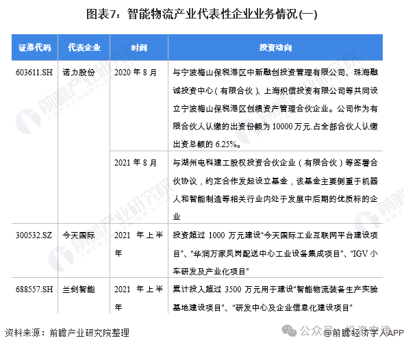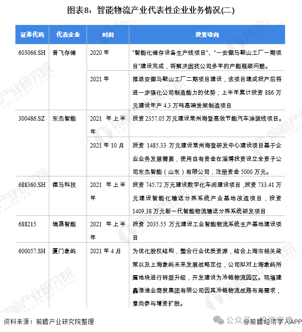 2020年以来,智能物流产业代表性企业的投资动向主要包括签署战略合作协议强强联合、通过对子公司增资的方式投资智能物流相关业务项目。智能物流产业代表性企业最新投资动向如下: