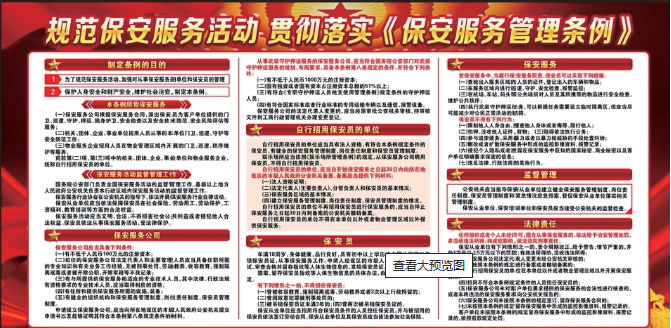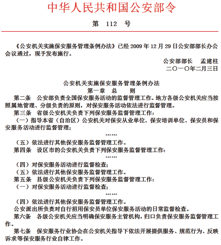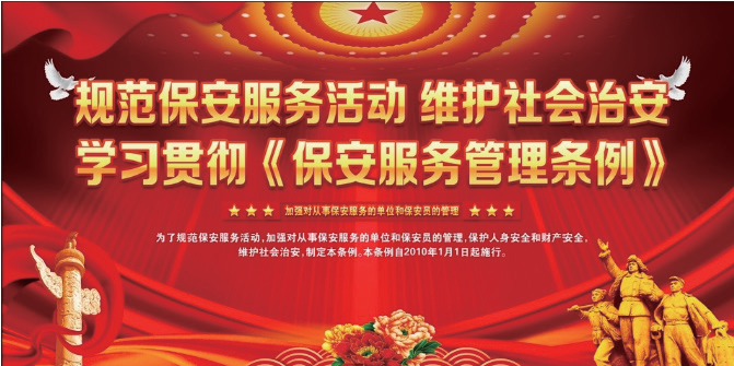 我国第一部为规范保安服务行业的行政法规《保安服务管理条例》在2010年正式施行,就是这样一部意义深远的管理条例,从列入立 法 工 作 议 事 日 程 到 真 正 出 台,足 足 历 经 了13个 春 秋 。事 实 上,从1984年深圳蛇口第一家保安公司成立起,在26年的实践中,公安部的保安服务工作始终秉承着这样的原则:为保安服务业这棵大树修剪枝丫、浇灌施肥,用建章立制和严格监管来规范它的每一步发展。《保安服务管理条例》的实施,即意味着保安服务市场向社会开放,部门垄断、地区封锁的局面被打破。这个根本性的变化,标志着保安服务这一特殊行业在市场开放的轨道上驶入了一个崭新的阶段。
