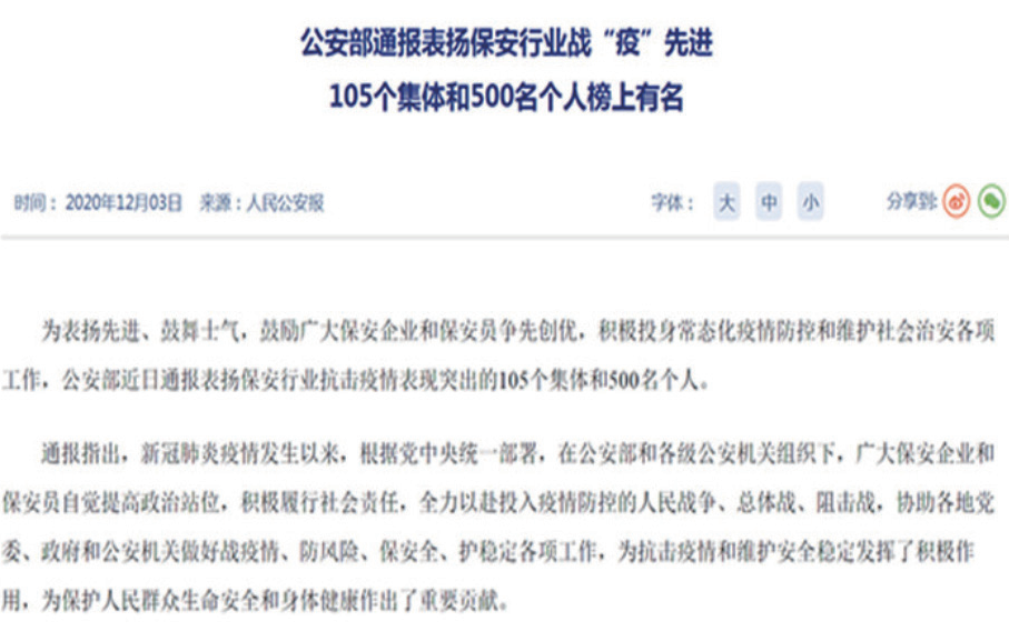 全国保安服务行业在做好服务客户工作的同时,坚持把社会效益放在首位,社会效益和经济效益相统一,勇于承担社会责任,积极参与社会治安防范工作,主动融入社会治安防控体系建设,全力协助和配合公安机关维护社会稳定各项工作,平均每年提供破案线索10万余条,抓获违法犯罪嫌疑人9万余名,参加各种大型活动安保约4万人次,在公安机关监督管理和推动下,全国保安行业在协助和配合公安机关打击犯罪、维护治安工作中交出了一份亮眼的成绩单。近5年来,全国共有119名保安员英勇牺牲,1.2万名保安员光荣负伤,涌现出无数的保安先锋,他们牢记责任、忠实履职、兢兢业业、昼夜守护,在平凡的岗位中发光发热贡献于社会与人民!