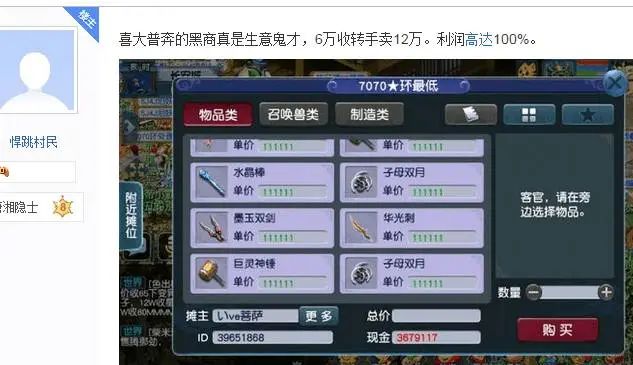 其实商人的嗅觉还是比较敏锐的,区里面70级武器的需求量增大了,前一阵子摆摊的全部都是8万或者9万梦幻币就可以买到70级的环装,现在没有11万是不可能了,但是商人收环时候的价格还没有变,依旧是6万梦幻币一个。