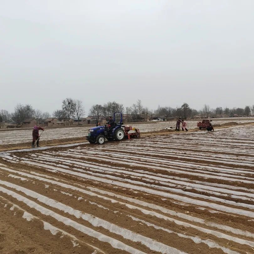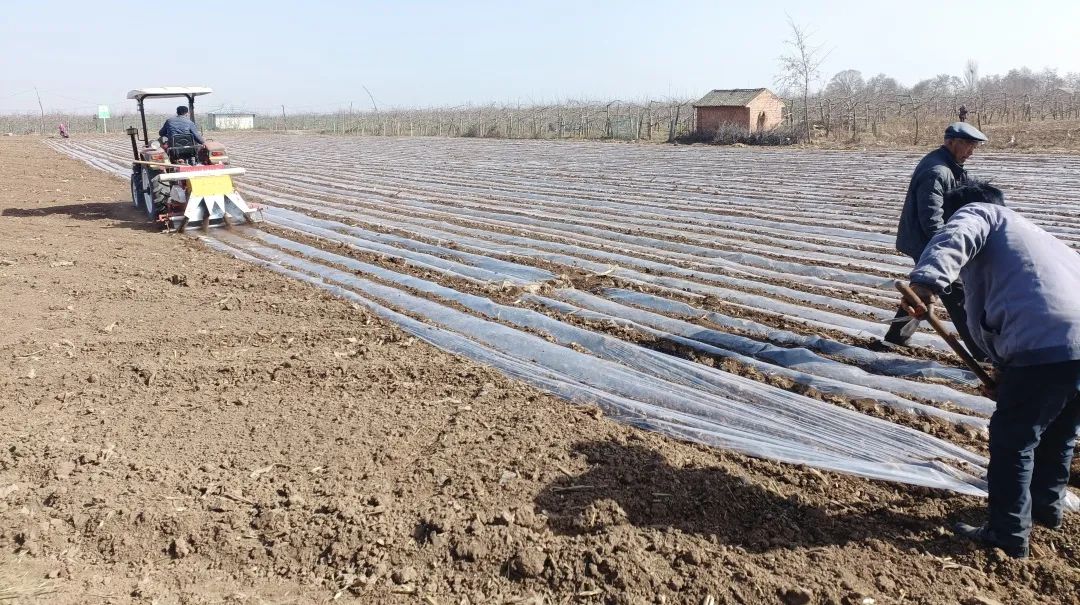 “趁着最近的天气好,镇上统一组织党员干部下沉一线,为群众提供地膜,技术上指导,目前我村产业区域已完成覆膜510亩,预计三月底全面完成春季果园管护工作。”旧集村委会副主任景拴纪边覆膜边详细介绍道。